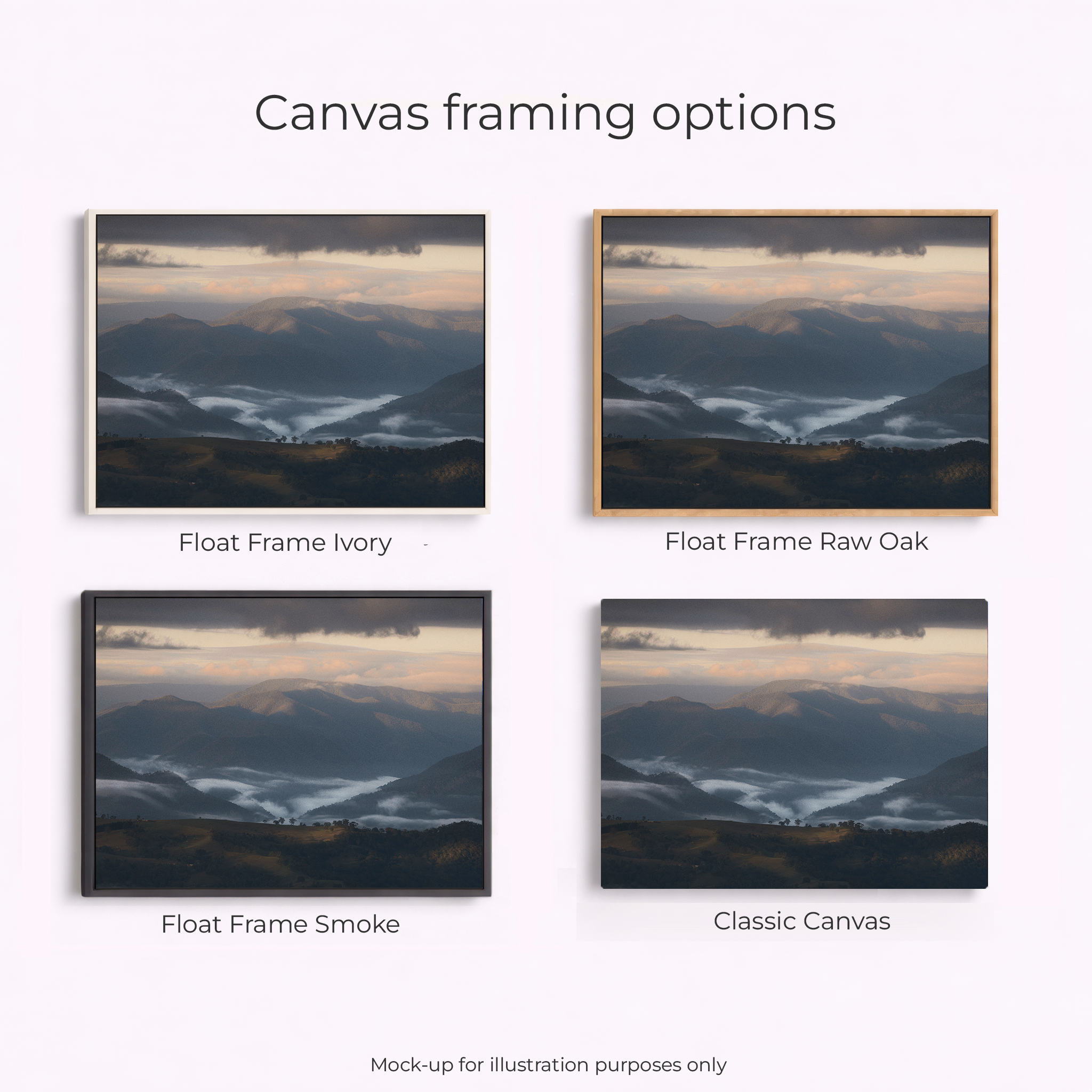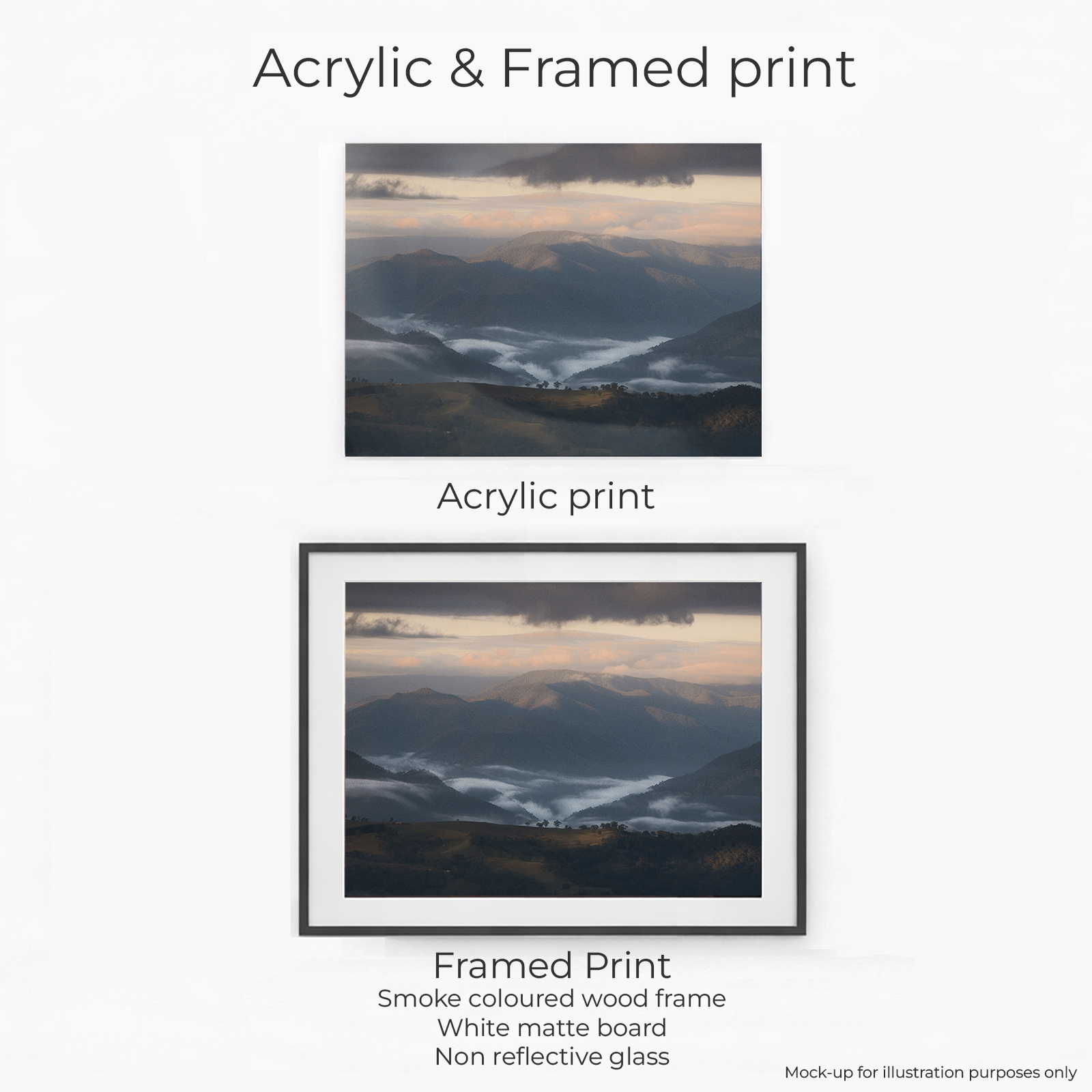 Acrylic Print, Canvas – Classic, Canvas – Float Framed – Raw Oak Colour, Canvas – Float Framed – Smoke Colour, Framed – Printing and Framing with Matboard, Paper Print – Cotton Rag, Paper Print – Matte Archival, Paper Print – Semi Gloss Luster