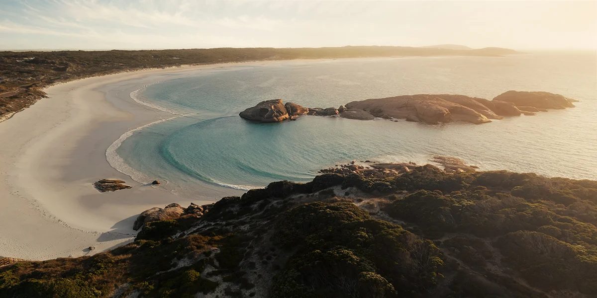 Twilight Beach in Esperance is a wide, bright strip of white sand with that unreal clear water, framed by smooth granite boulders at either end. The standout feature is the big rock sitting in the bay. This is the local “jump rock” where people swim out, climb up, and launch into the deep, glassy water below. It gives the beach a fun, social feel, especially on warm afternoons. The bay is perfect for an easy swim, a float in the shallows, or a slow walk along the shoreline with classic Esperance blues stretching out in front of you.