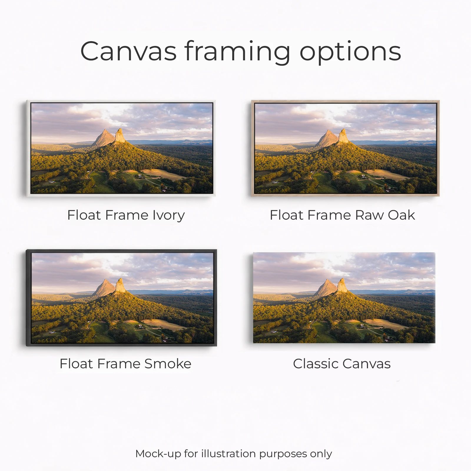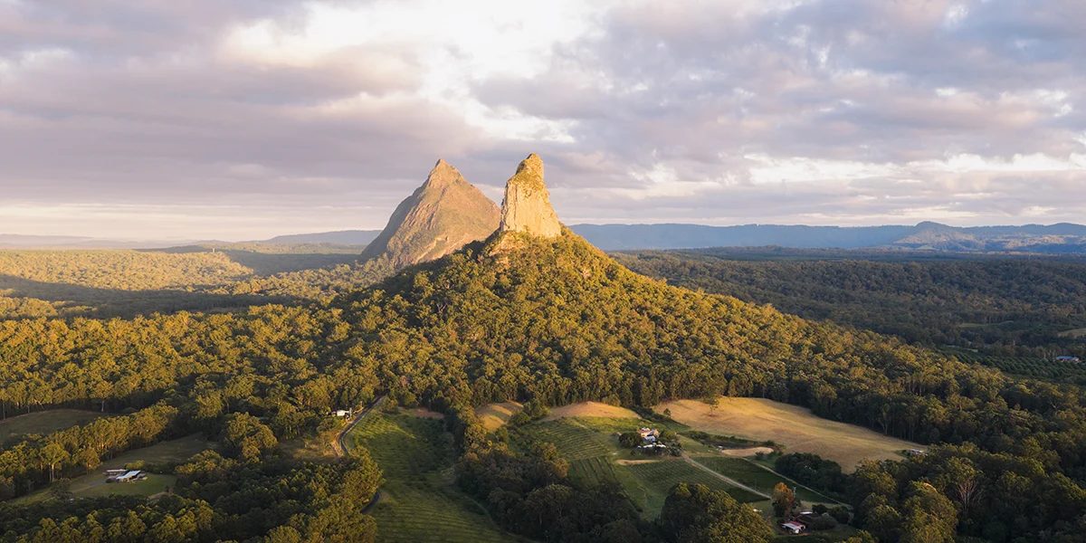 Golden light spilling over the Glass House Mountains, looking straight toward Mount Coonowrin and Mount Beerwah as the day wakes up. The volcanic peaks rise sharply out of a sea of forests and houses. The soft cloud and pastel sky adding that calm, early-morning feel. It’s a classic Sunshine Coast hinterland scene — rugged silhouettes, rolling forest, and that warm glow you only get for a few minutes. Perfect as a statement print for anyone who loves Queensland landscapes and big open views.