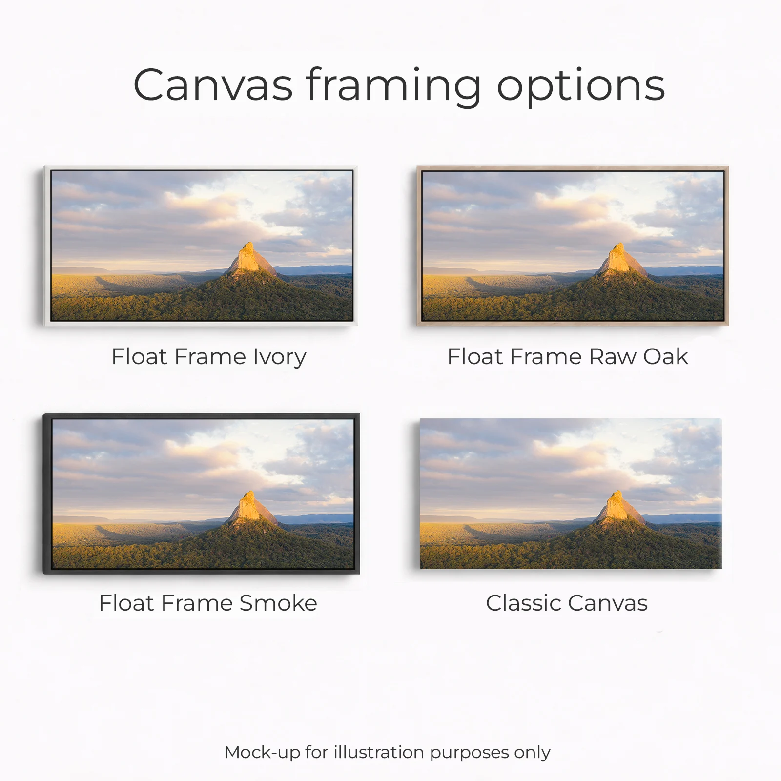 Golden light spilling over the Glass House Mountains, looking straight toward Mount Coonowrin and Mount Beerwah as the day wakes up. The volcanic peaks rise sharply out of a sea of forests and houses. The soft cloud and pastel sky adding that calm, early-morning feel. It’s a classic Sunshine Coast hinterland scene — rugged silhouettes, rolling forest, and that warm glow you only get for a few minutes. Perfect as a statement print for anyone who loves Queensland landscapes and big open views.