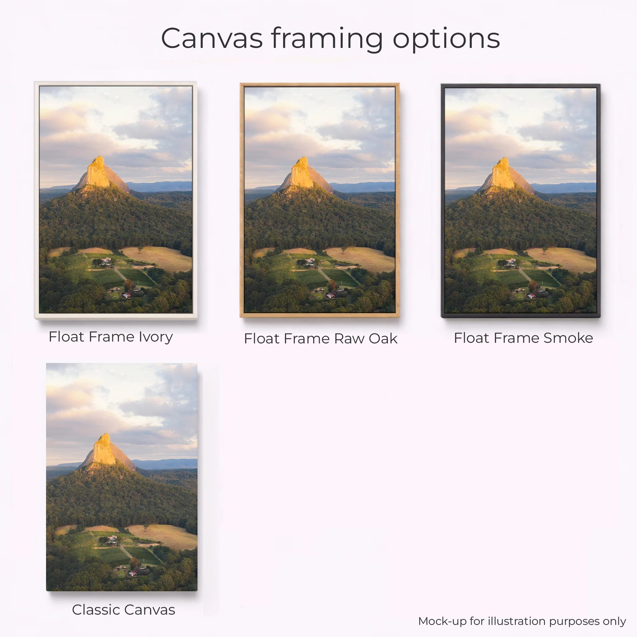 Golden light spilling over the Glass House Mountains, looking straight toward Mount Coonowrin and Mount Beerwah as the day wakes up. The volcanic peaks rise sharply out of a sea of forests and houses. The soft cloud and pastel sky adding that calm, early-morning feel. It’s a classic Sunshine Coast hinterland scene — rugged silhouettes, rolling forest, and that warm glow you only get for a few minutes. Perfect as a statement print for anyone who loves Queensland landscapes and big open views.