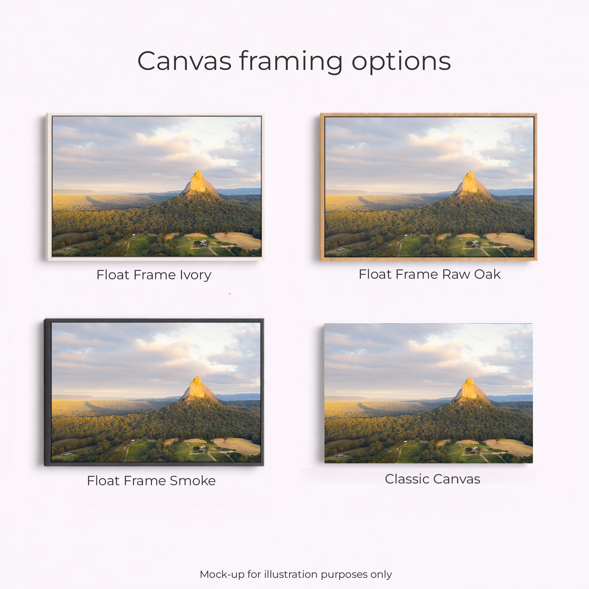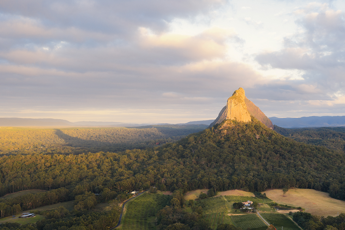 Golden light spilling over the Glass House Mountains, looking straight toward Mount Coonowrin and Mount Beerwah as the day wakes up. The volcanic peaks rise sharply out of a sea of forests and houses. The soft cloud and pastel sky adding that calm, early-morning feel. It’s a classic Sunshine Coast hinterland scene — rugged silhouettes, rolling forest, and that warm glow you only get for a few minutes. Perfect as a statement print for anyone who loves Queensland landscapes and big open views.