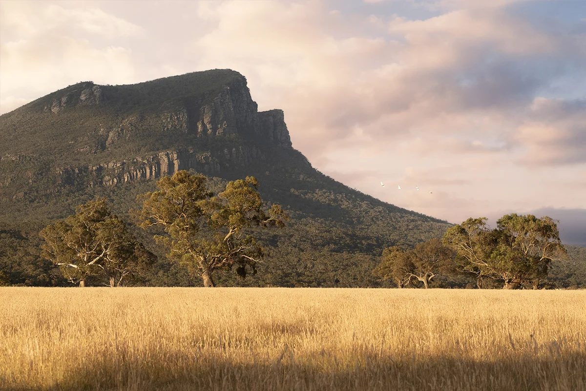 Sunrise in Dunkeld with Mount Abrupt standing strong in the distance while the sky filled with soft pink cloud. Mount Abrupt is known for its steep ridgelines and striking triangular profile. It is one of the region’s most iconic and visually dramatic peaks.