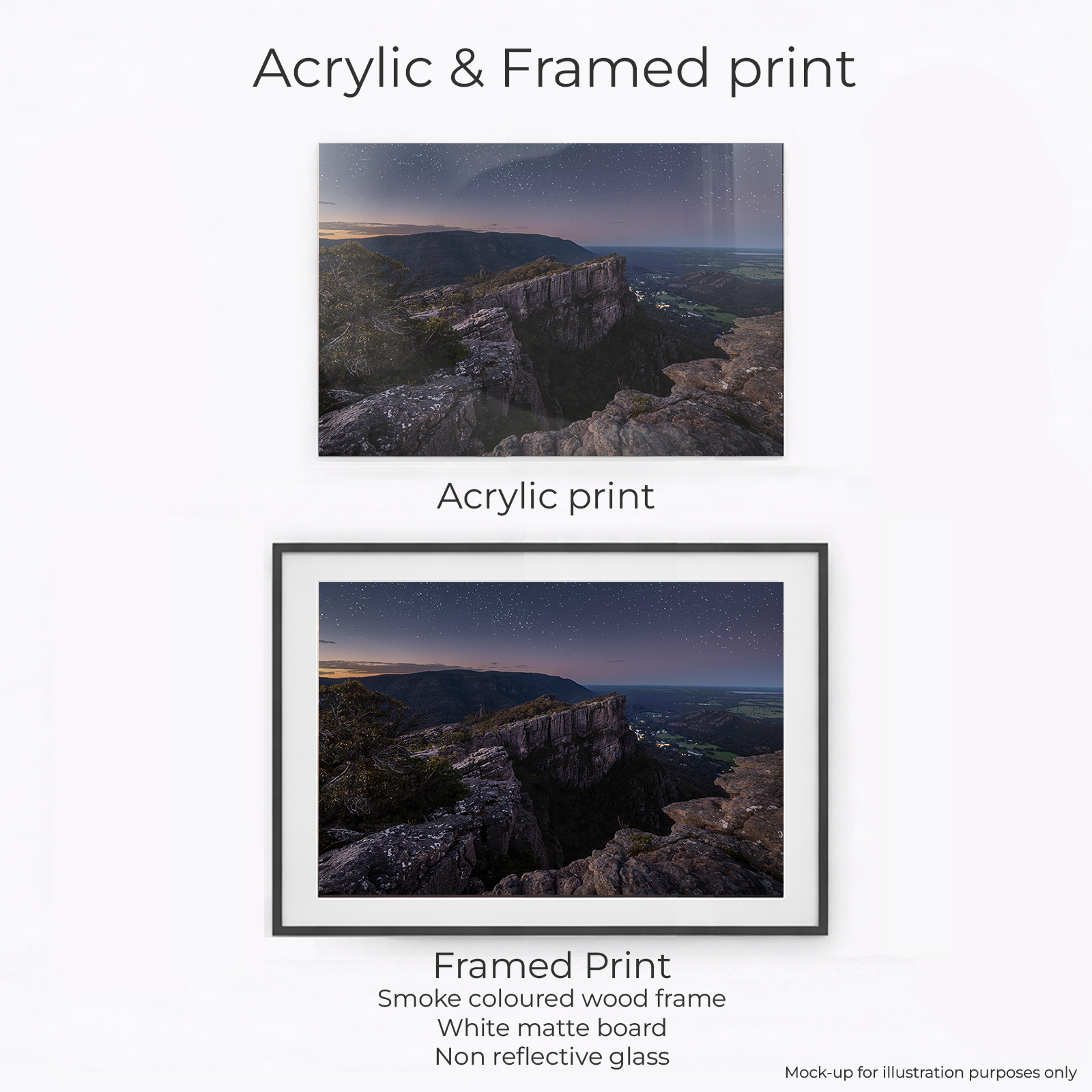 Twilight at the Pinnacle feels like the Grampians in two worlds at once — the last orange glow of sunset hanging on the horizon while the first stars quietly appear overhead. The cliffs fade into soft blue shadow, and far below, the lights of Halls Gap start to shimmer through the dusk. A perfect, peaceful moment between day and night.