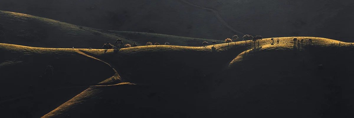 Late afternoon light rolls gently across the hills of Strath Creek, tracing the curves of the land in bands of gold and shadow. Scattered gums and quiet fence lines give scale to the vast, folded landscape. The soft glow on the ridgelines brings a calm, almost painterly feel to this classic pocket of regional Victoria.