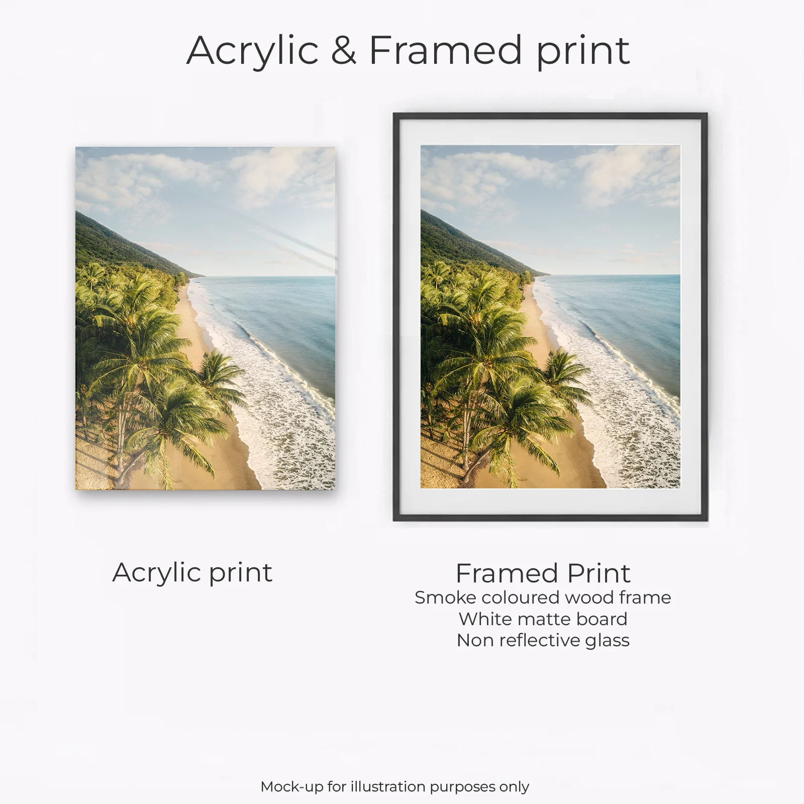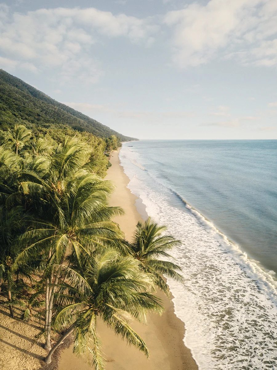 This print captures Ellis Beach, where rainforest meets the Coral Sea just north of Cairns. A long stretch of golden sand curves along the coast, lined with postcard-perfect palm trees that frame the shoreline. Forested hills rise behind the beach, pointing toward the horizon. Ellis Beach is a more untouched alternative to its neighbour Palm Cove which is a bustling tourist hub. Less crowds and shops. Just a picturesque classic Far North Queensland coastline.