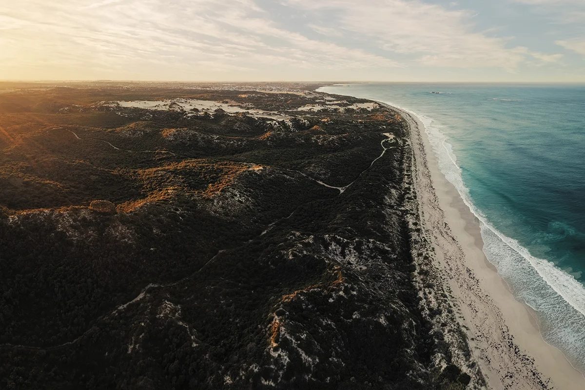 Mindarie Beach sits in the Northern suburbs of Perth. Despite looking directly towards the CBD in this image, you wouldn’t be able to tell from how remote it looks in the photo. The beach is a close escape from the city where you can find that classic WA combo of light coloured sand, low dunes, and clear Indian Ocean colour.