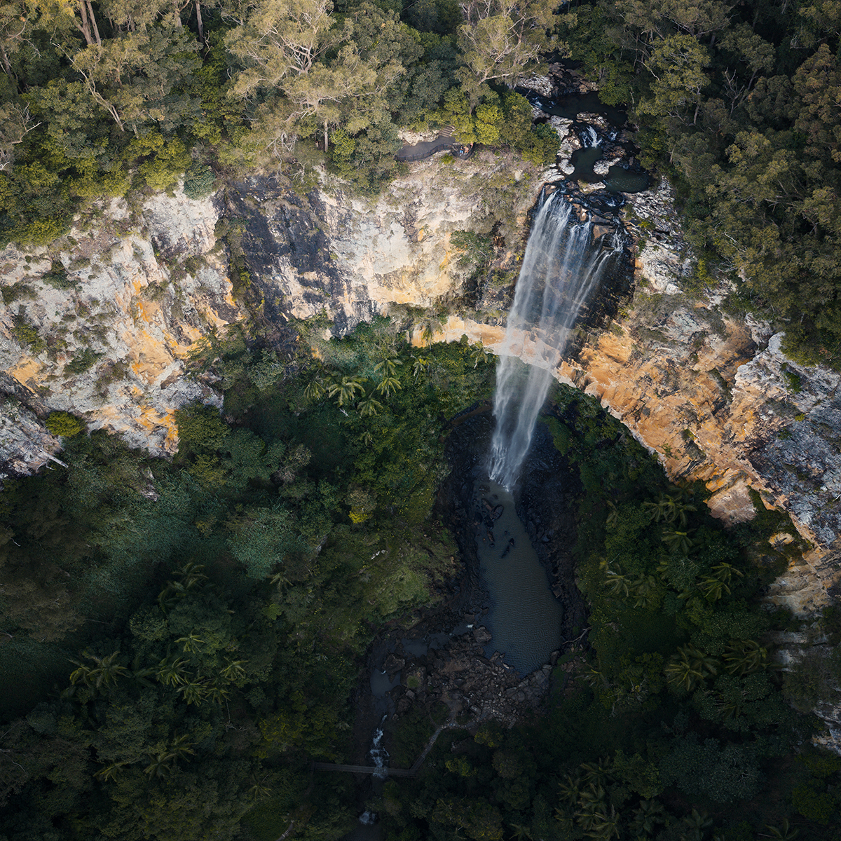 Purling Brook Falls in Springbrook National Park is a large Gold Coast Hinterland waterfall. The creek falls 100 metres off the sheer cliff into the rainforest gorge below. There are easily accessed lookouts at the top of the cliff. Or you can walk the circuit down to the base where there is a suspension bridge across the creek. This is a great stop for photos before the steep ascent back up. With a picnic area and toilets at the car park, this is easily a highlight of the area.