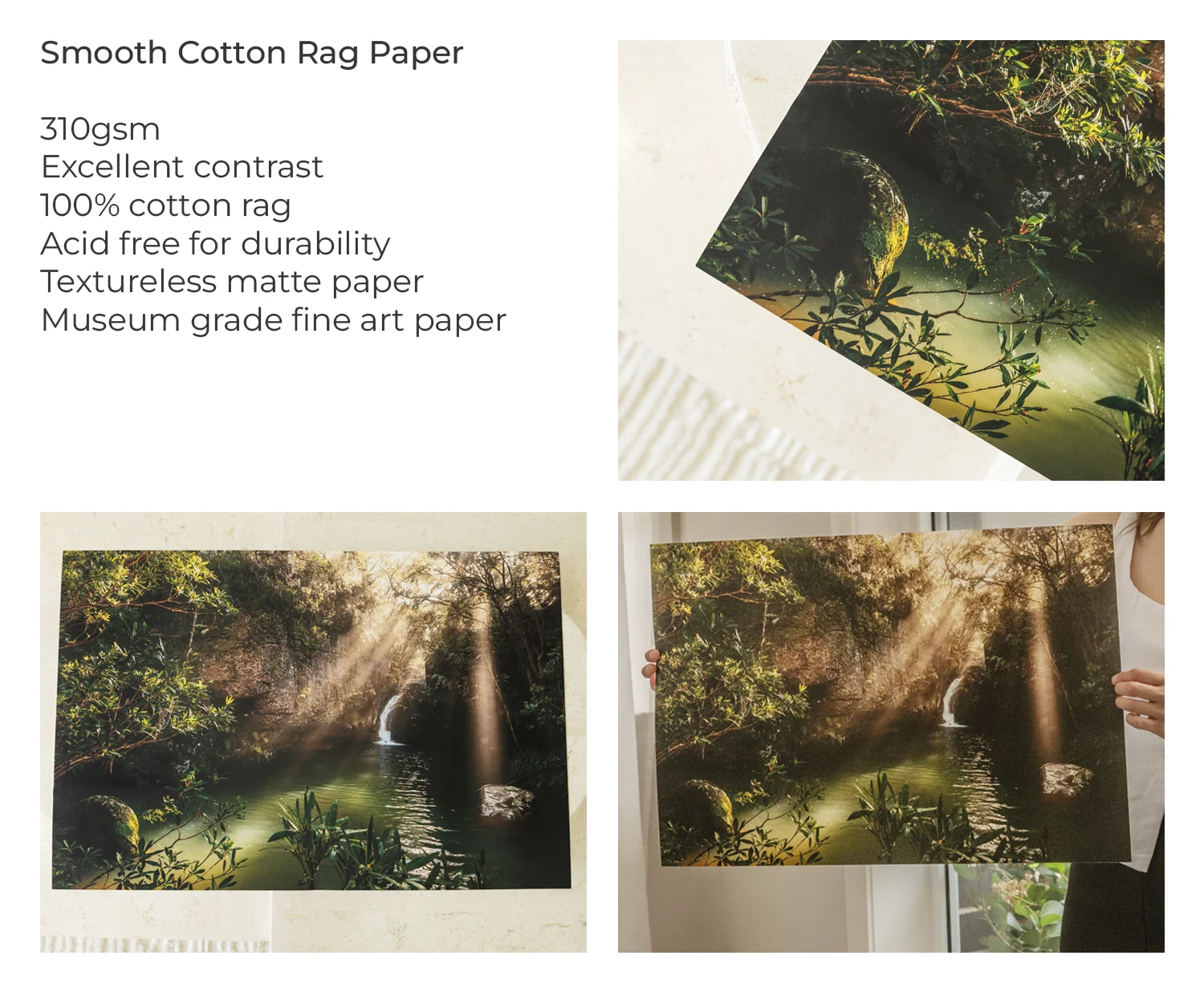 Our top choice for museum-grade fine art printing, this 310gsm paper offers a luxurious matte finish with excellent contrast and deep blacks. Made from 100% cotton rag, it is acid- and lignin-free to ensure the durability and long-term preservation of artwork. With high colour consistency and a wide colour gamut, this paper delivers exceptional quality and detail for professional photography, digital art works and archival reproductions.