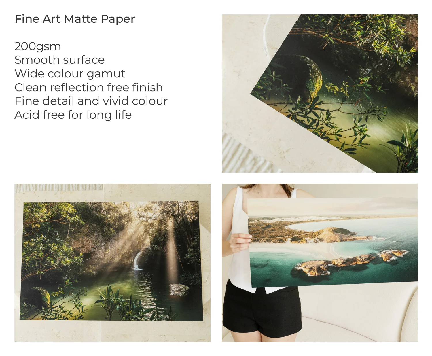 Our 200gsm matte photo paper features a smooth, texture-free surface, good for fine detail whilst maintaining vivid colours. With no reflections, it provides a clean, elegant finish ideal for art reproductions and photography. Its acid- and lignin-free composition ensures long-lasting quality, preventing colours from shifting over time.