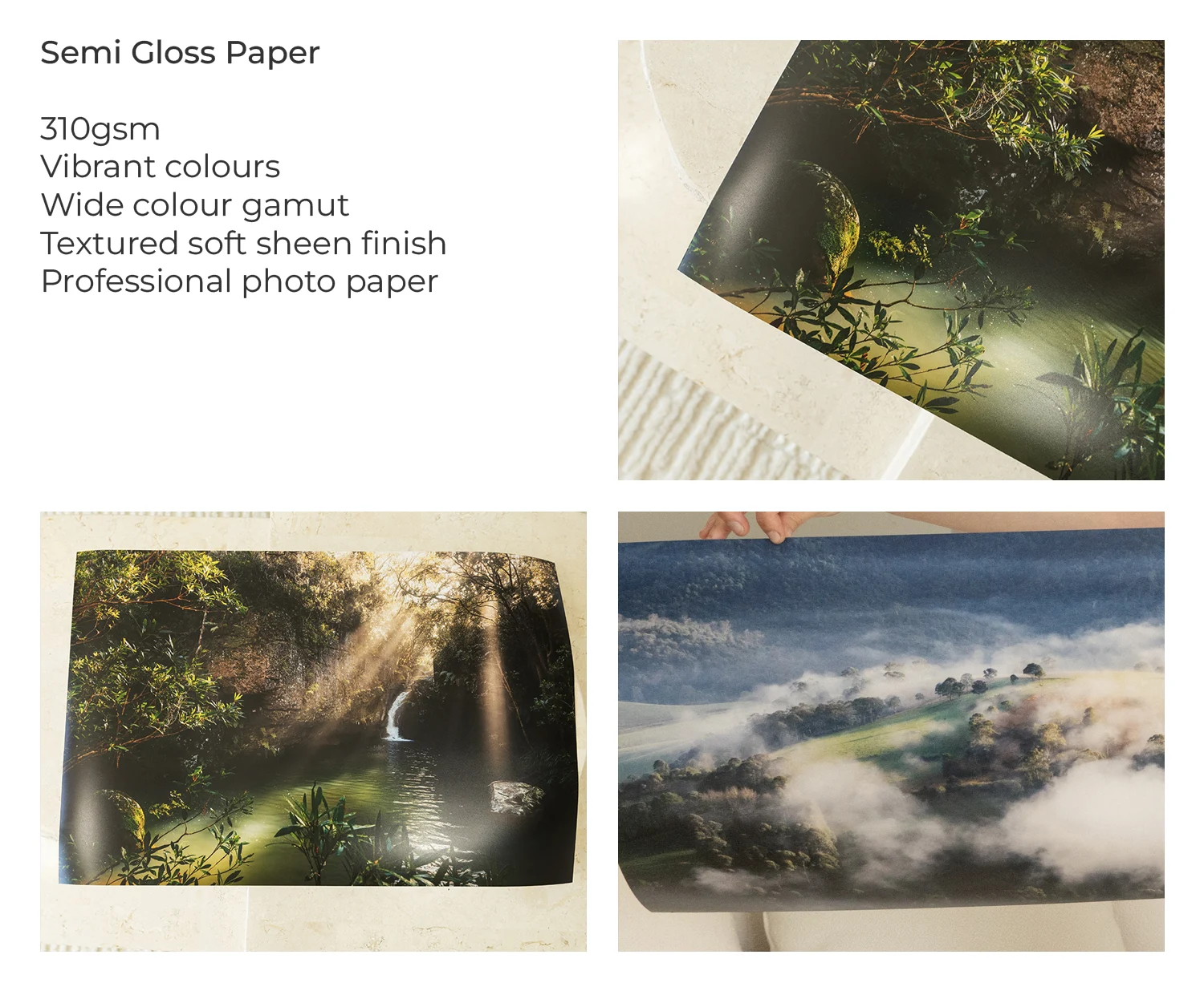 Our smooth semi gloss paper is finished with a pearl semi gloss coating that gives it a soft sheen. At 310gsm it gives a premium feel. It offers vibrant and crisp details from its wide colour gamut. A great choice for a result that has a slight gloss, professional photo paper look.